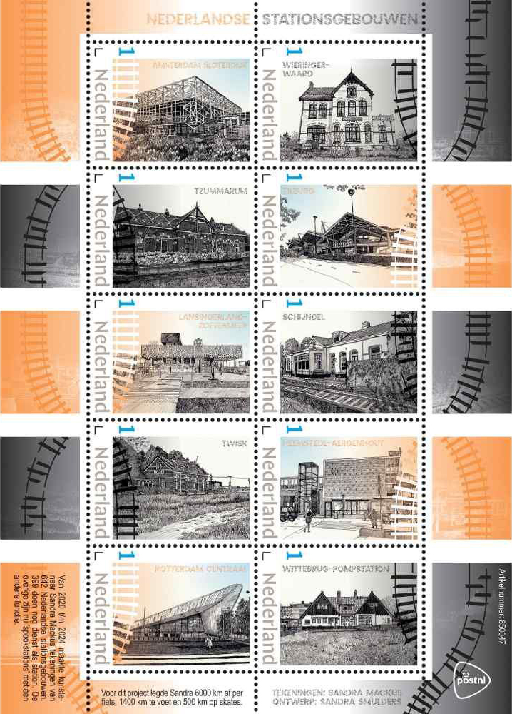 In Nederland staan 399 gebouwen die in gebruik zijn als spoorwegstation en 243 gebouwen die dat ooit waren, maar inmiddels een andere bestemming hebben gekregen. Van elk van deze 642 stationsgebouwen heeft kunstenaar Sandra Mackus de afgelopen jaren een pentekening in zwart-wit van de buitenkant gemaakt, op A5-formaat. Op de postzegels Nederlandse stationsgebouwen zijn de volgende Nederlandse stations afgebeeld: Amsterdam Sloterdijk, Wieringerwaard, Tzummarum, Tilburg, Lansingerland-Zoetermeer, Schijndel, Twisk, Heemstede-Aerdenhout, Rotterdam Centraal en Wittebrug-Pompstation.